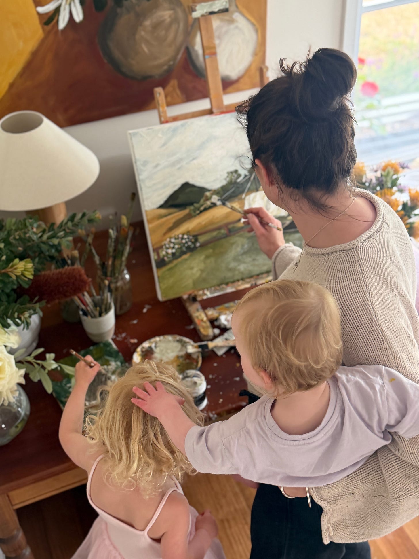 When I do paint, it’s in amongst the rhythms of our daily life. Sometimes I’ll get a chunk in while the baby sleeps if my husband has the older two off on an adventure, but even then—it’s rare! To carve out painting time, I have to ignore the piles of washing, dirty dishes, the never-ending list of chores and errands, and paint when the moment presents itself. I have to take little pockets of time when I can… like when naps miraculously line up. This can mean that paintings take months to finish, but I feel very lucky to be able to work and fill my creative cup while looking after my babies.
