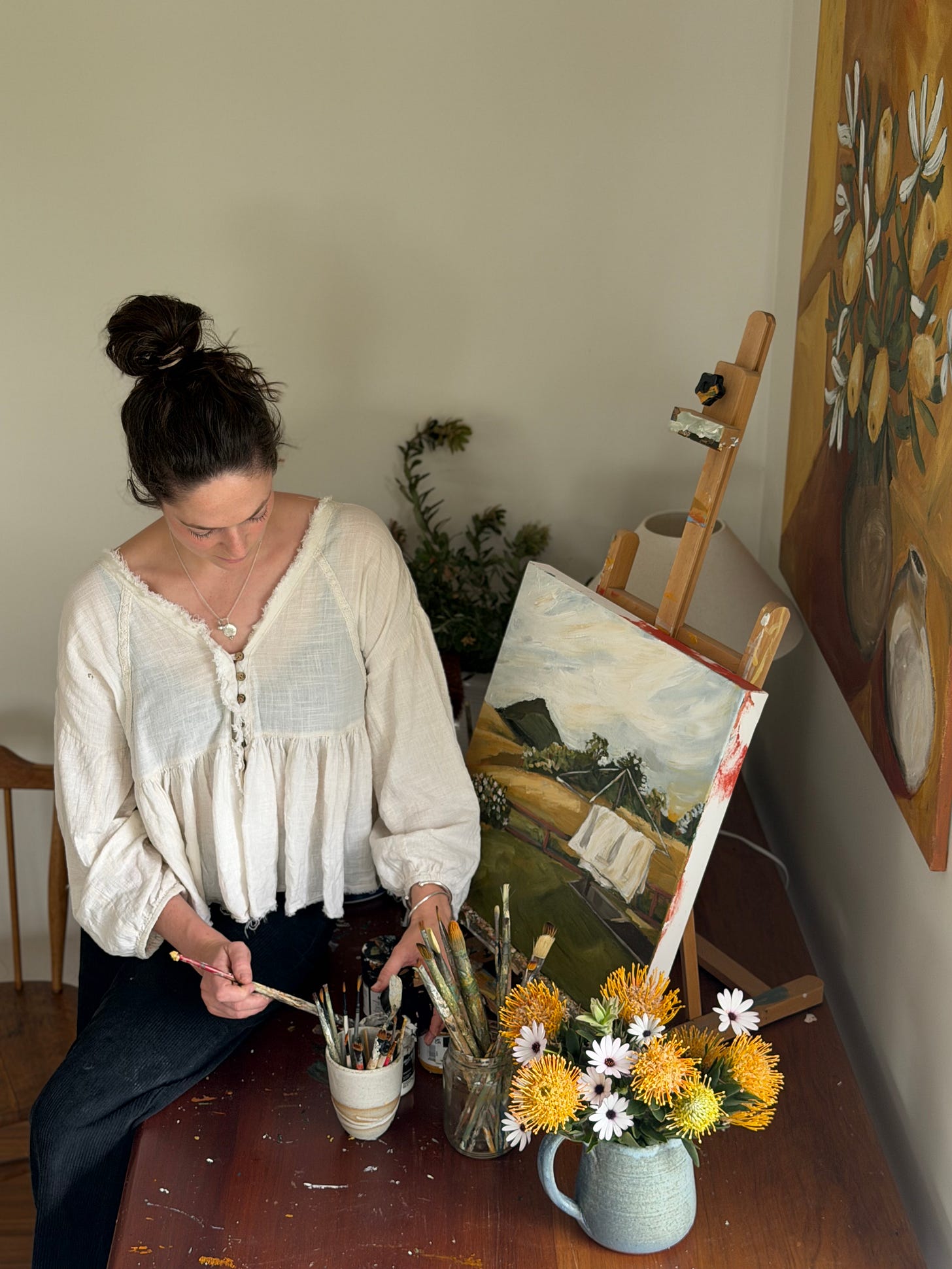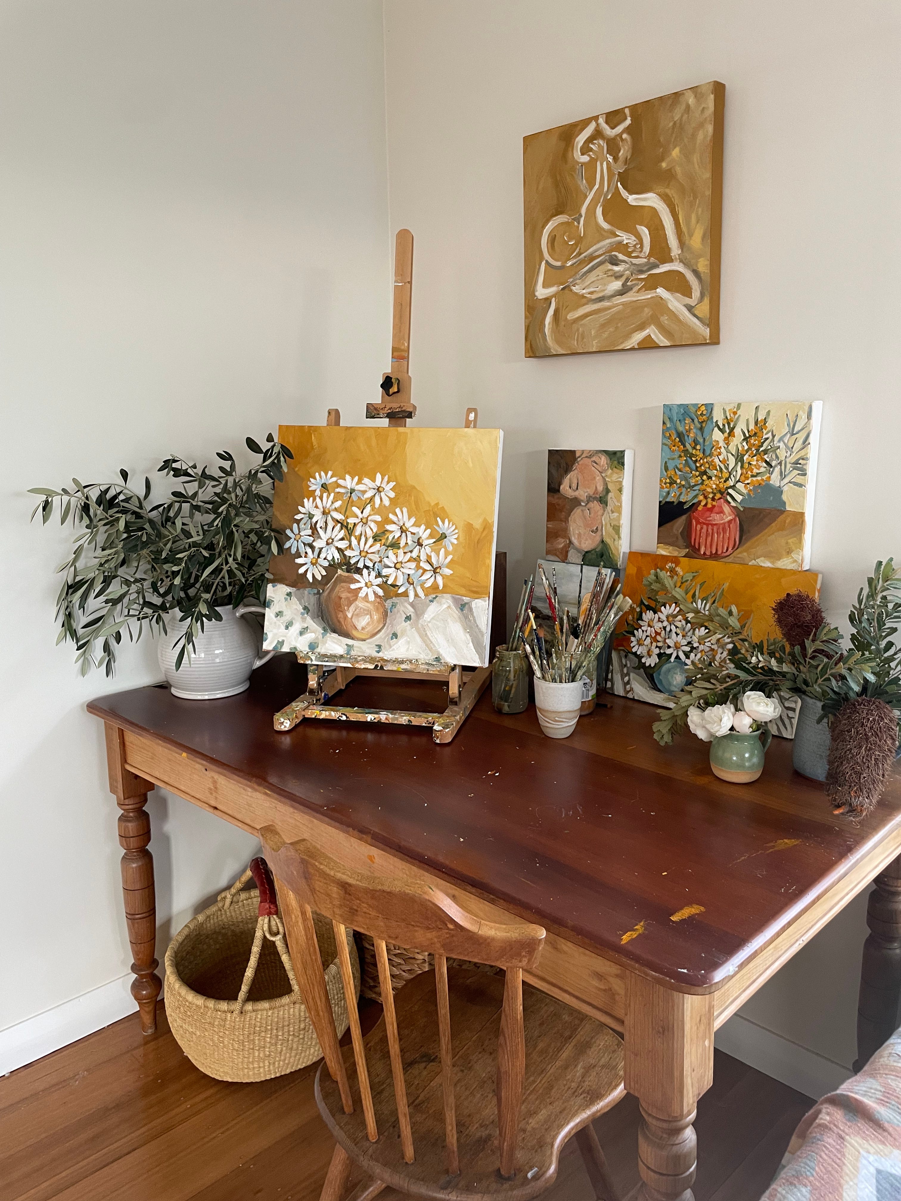 After my pottery internship, my partner (now husband), Tom, and I lived on Minjerribah (North Stradbroke Island) while he was completing some training for work. I worked remotely in an admin role (paid the bills, and I’m very grateful for this because it meant I could focus my creative attention on what was next), and I was just so inspired by my natural surroundings. I was drawn to painting again, and I explored capturing the coastal flora in lots of mediums. My first painting sold through a local art gallery, and I thought—well, maybe this is actually possible! I kept painting, and selling work on social media and through galleries and interior stores. I feel incredibly lucky to still have those platforms to allow me to work and create while raising small children.