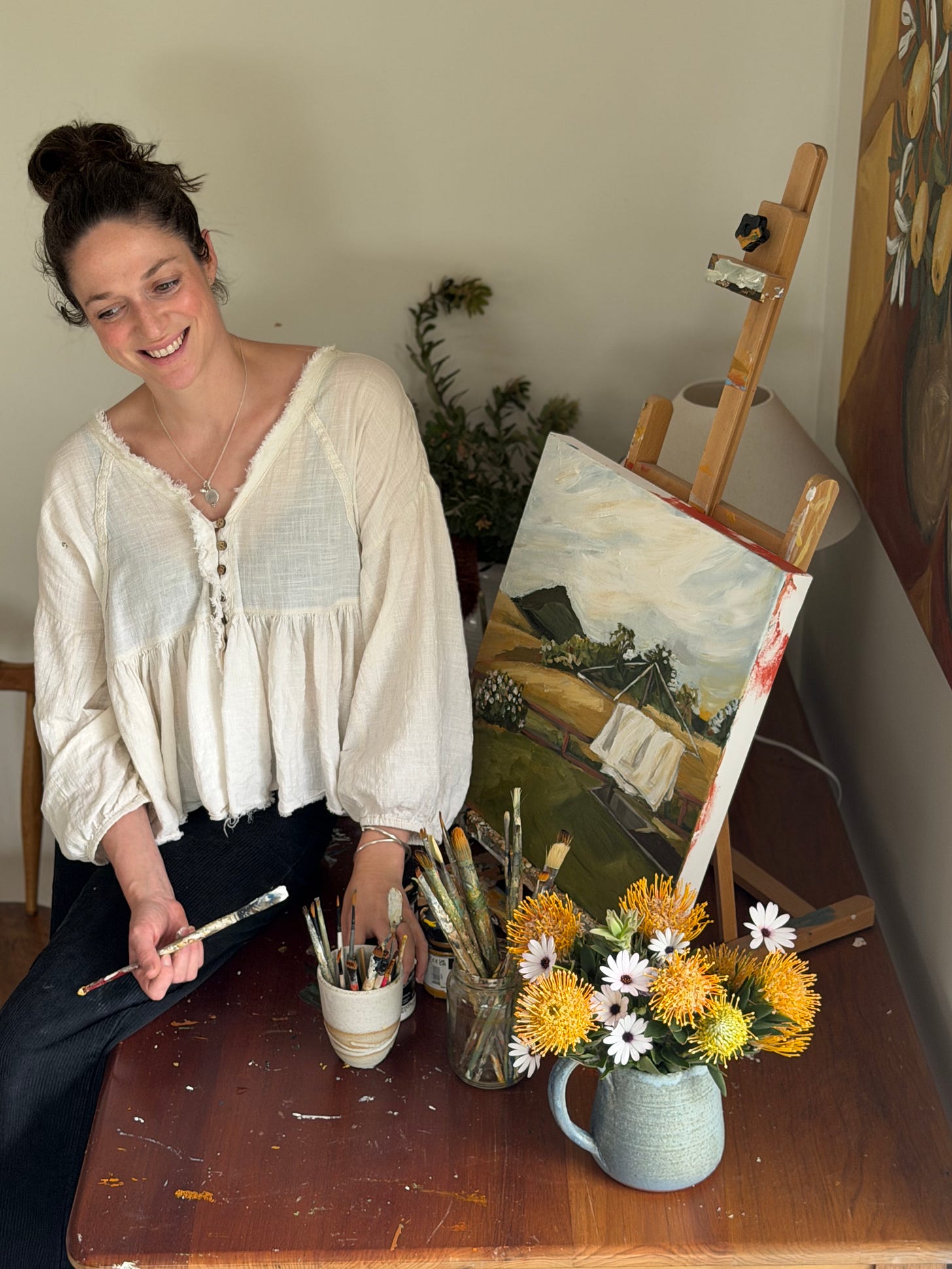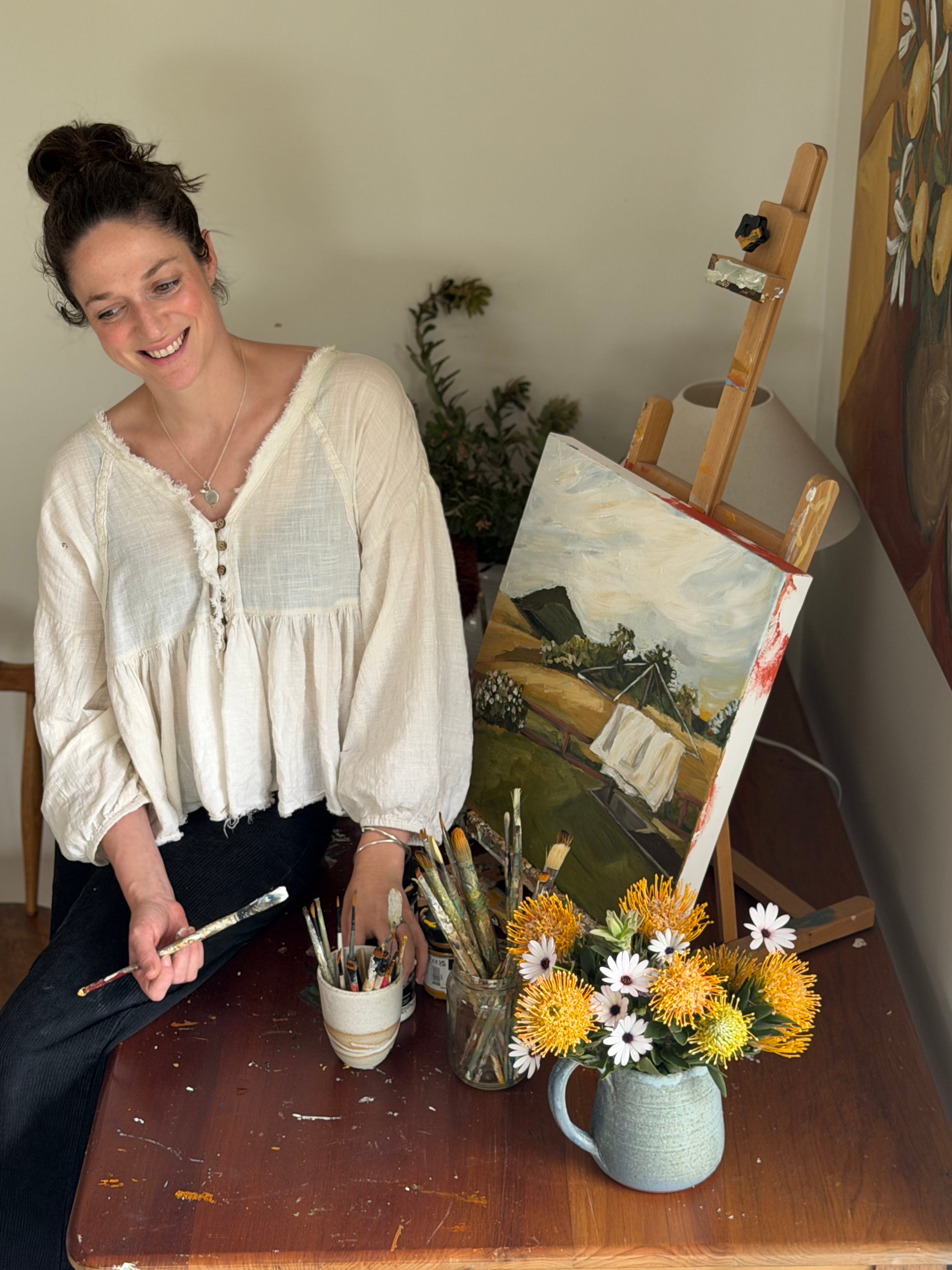 I studied art history at university and was always fascinated by the philosophy behind the 17th-century Dutch concept of the ‘still-life’—elevating the mundane, domestic, and transient to be something of importance, to symbolise the fleetingness of life. I fell in love with this philosophy, which celebrates the objects that make up the fabric of our everyday existence. What a beautiful idea, appreciating the small, humble things that ultimately shape our lives. I think about this every time a simple bunch of flowers collected from the garden brings me joy, we gorge on fruit from trees in our garden, or I feel called to paint a simple scene of my kids exploring at the beach. I’m also forever collecting handmade ceramics to bring a sacredness to everyday rituals.